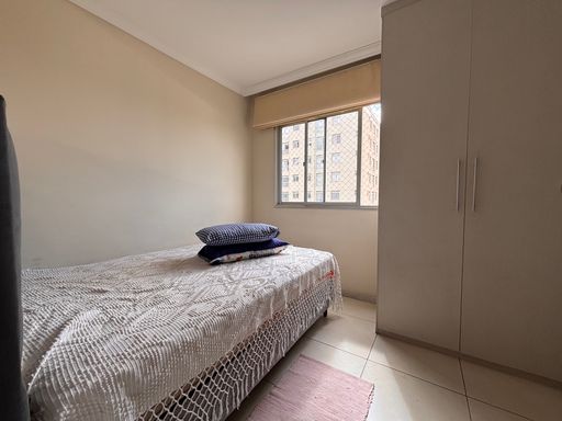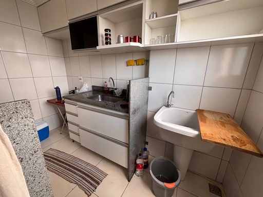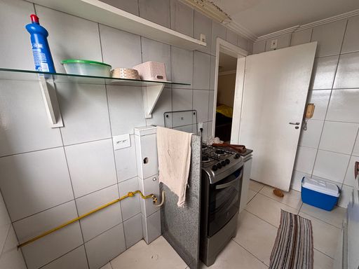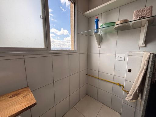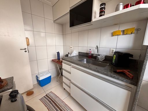 A cozinha é equipada com bancada em granito e armários planejados, com ótimo aproveitamento interno, além de contar com área de lavanderia. O apartamento dispõe ainda de uma vaga de garagem demarcada.