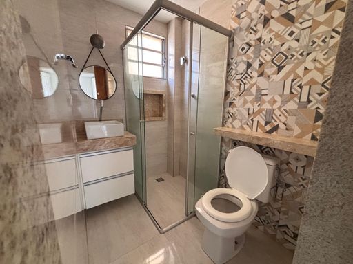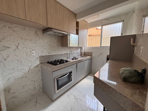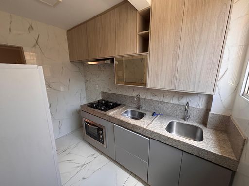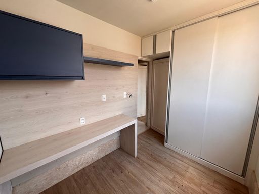Os três quartos são amplos e contam com armários planejados, oferecendo excelente aproveitamento de espaço e organização. O banheiro também possui móveis planejados e acabamento refinado, enquanto a cozinha é toda montada, funcional e equipada, ideal para quem gosta de praticidade e bom gosto.