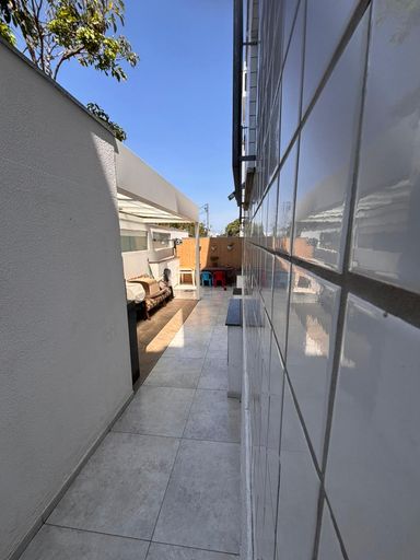 A cozinha funcional e bem planejada se conecta à área de serviço espaçosa, garantindo praticidade no dia a dia. O banheiro social complementa o conforto dos moradores, enquanto o piso em porcelanato em todos os cômodos adiciona um toque de sofisticação e elegância ao imóvel.