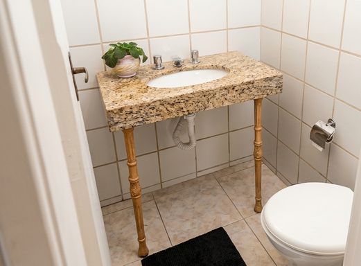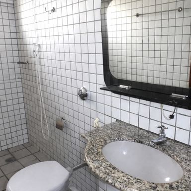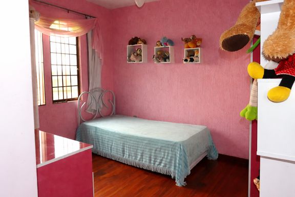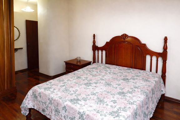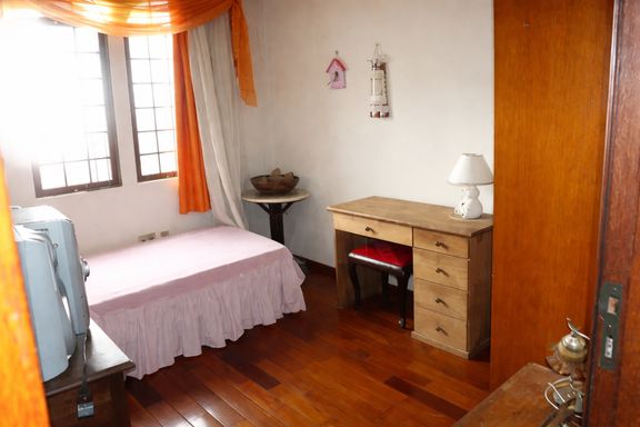 No segundo pavimento, a casa dispõe de três quartos com piso em taco bem conservado, sendo um deles com suíte, proporcionando mais conforto e privacidade. Há também um banheiro social que atende aos demais quartos, com boa distribuição para o uso familiar.