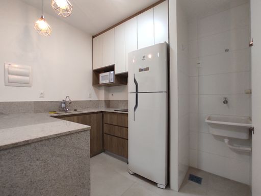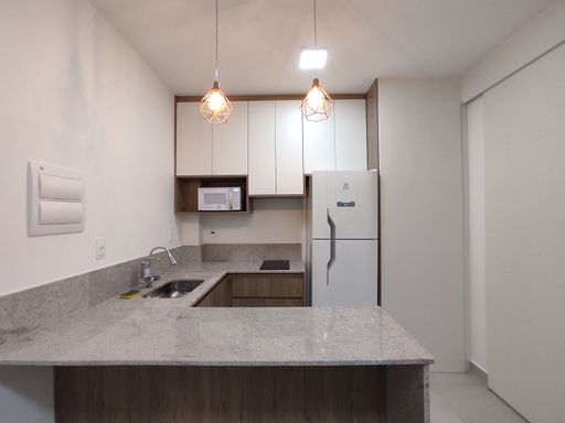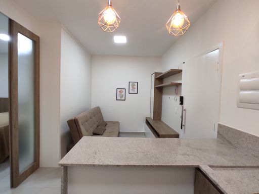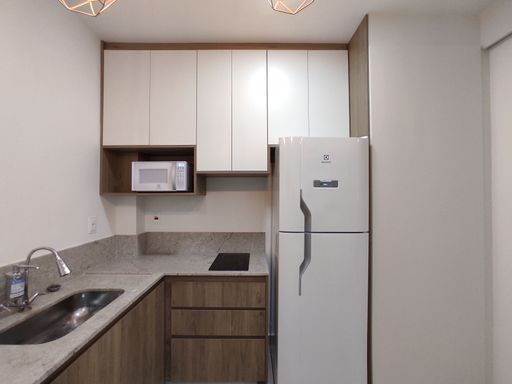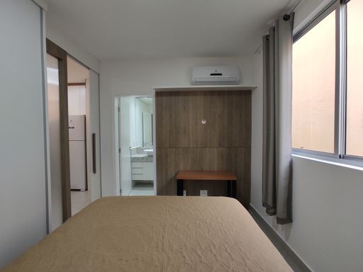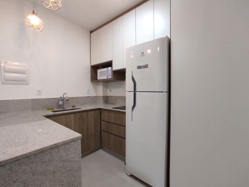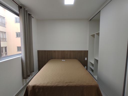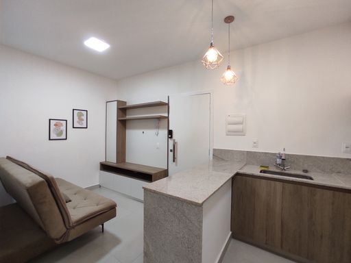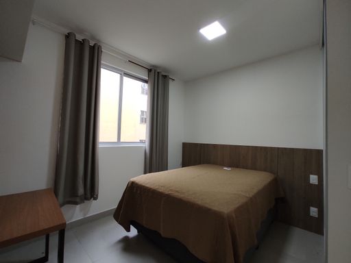 O bem-estar é um dos grandes destaques desta kitnet para alugar no bairro Ouro Preto. O imóvel conta com um quarto equipado com armário planejado, cama de casal e ar-condicionado, proporcionando conforto térmico e organização. O banheiro possui armário, espelho e box blindex, garantindo funcionalidade e bom acabamento. A sala é aconchegante, mobiliada com sofá e rack, criando um ambiente agradável para descanso. A cozinha em estilo americana dispõe de armário planejado, geladeira, fogão por indução e micro-ondas, oferecendo praticidade e integração entre os ambientes. A distribuição inteligente dos espaços favorece a ventilação, a iluminação natural e o aproveitamento eficiente da área interna.